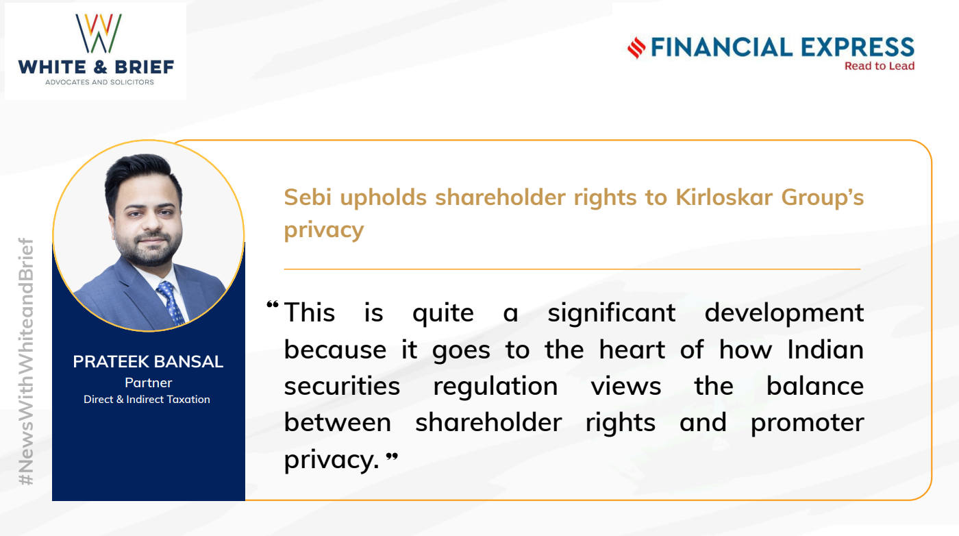 We are pleased to share that our ๐ฃ๐ฎ๐ฟ๐๐ป๐ฒ๐ฟ, Prateek Bansal, has been quoted in an article published by Financial Express (India) titled: #SEBI upholds #shareholder rights to Kirloskar Group's #privacy.